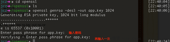 生成私钥,命令行执行openssl genrsa -des3 -out app.key 1024,截图如下