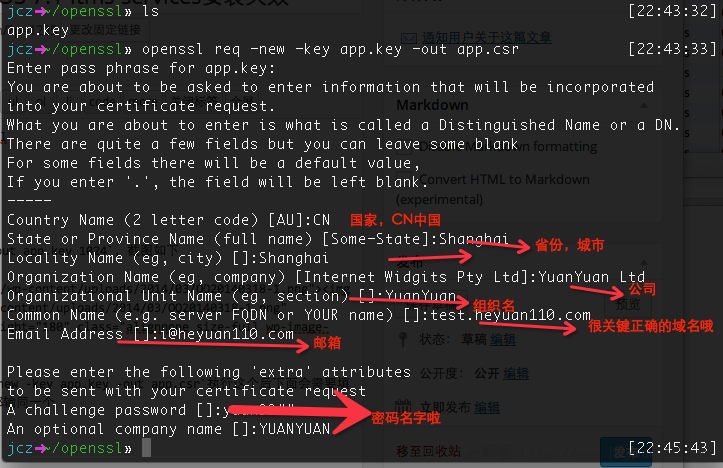 很清晰了吧,下面继续生成签署申请openssl req -new -key app.key -out app.csr执行这个后下面会需要填一些信息,截图如下,密码的地方可以都输同一个